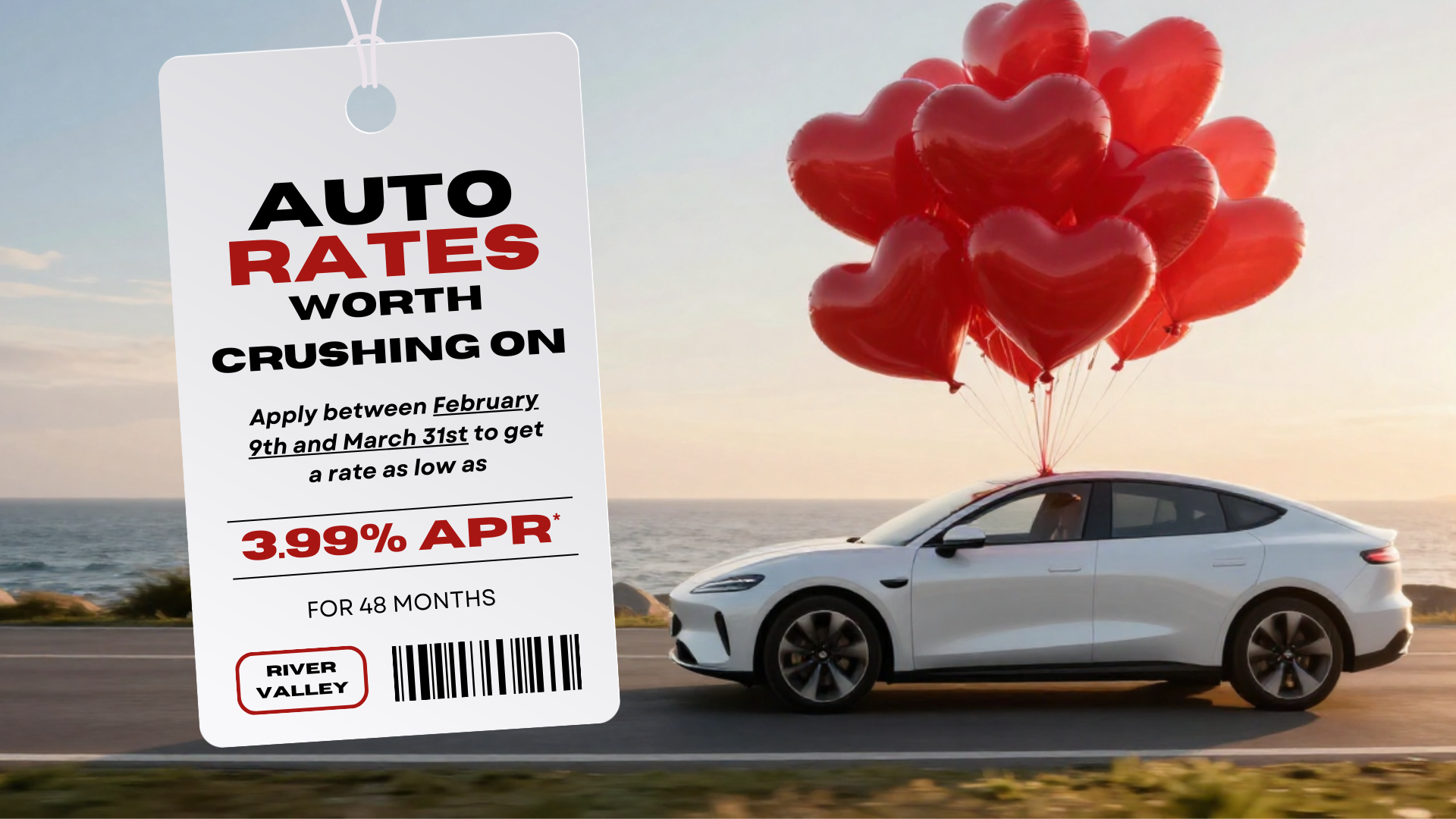 * APR = Annual Percentage Rate. Promotional rate valid on model years 2023 and newer with fewer than 100,000 miles. Refinance of current River Valley Credit Union loans does not qualify for promotional rate. A $20,000 loan amount with $125 processing fee will result in 48 monthly payments of $448.78, if first payment is made within 30 days. Subject to application and credit approval. Rates subject to change. Not every member will qualify for the lowest rate and/or longest term. Other rates, terms, payments and loan amounts are available. Rate may vary depending on each individual’s credit history and underwriting factors. Loans must be closed with a River Valley associate. Offer valid 2/9/2026-3/31/2026.